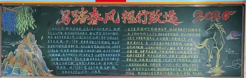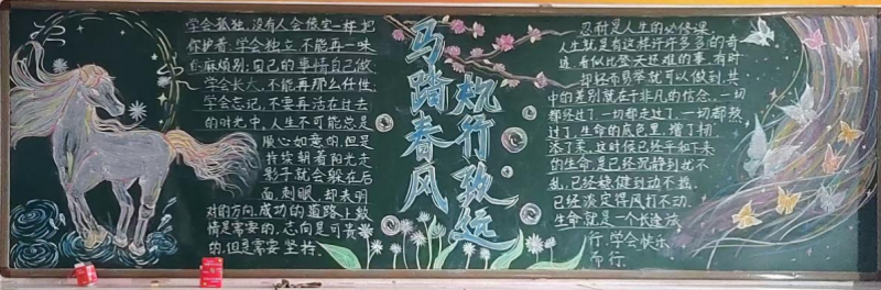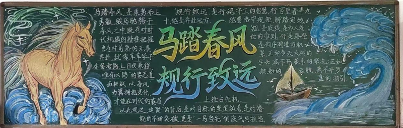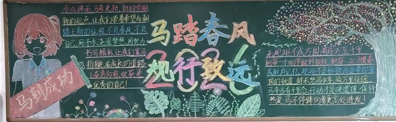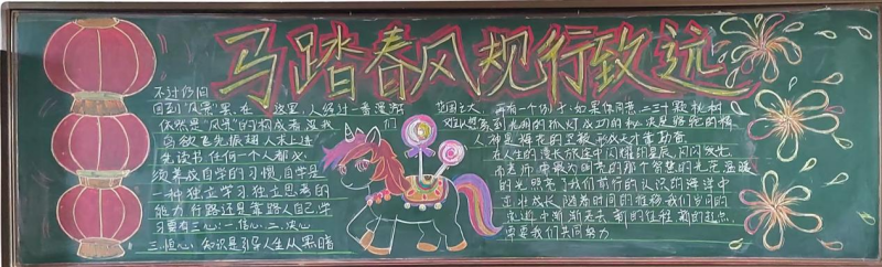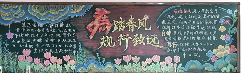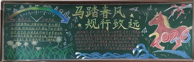 为引导学生养成良好的行为习惯,展现新学期昂扬向上的精神风貌,我校政教处举办了以“马踏春风 规行致远”为主题的黑板报比赛。各班精心策划,巧妙设计,一面面黑板变成了会“说话”的宣传阵地。有的立意深刻发人深省,有的图文并茂生动有趣,充分展现了各班独特的班级文化和积极向上的精神风貌。